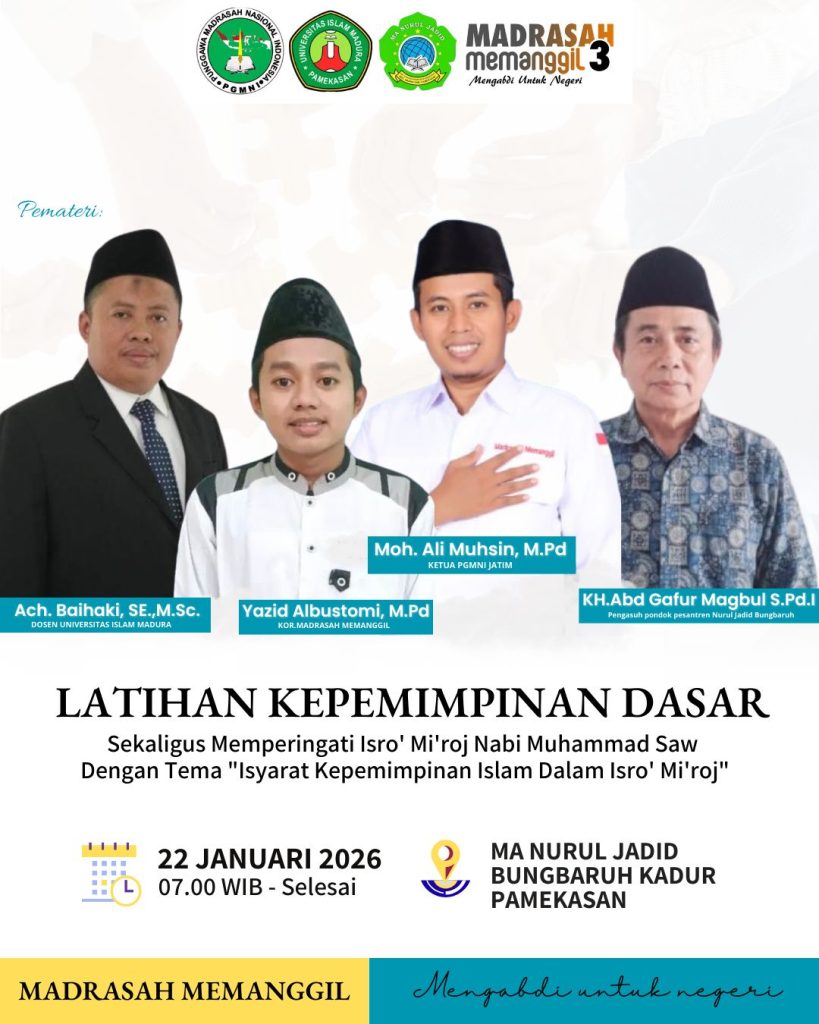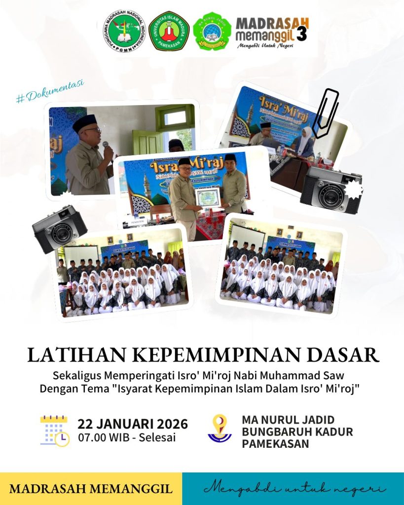 Kegiatan tersebut diselenggarakan di MA Nurul Jadid, wilayah Pamekasan, pada 22 Januari 2026. Acara ini mengangkat tema “Isyarat Kepemimpinan Islam dalam Isro’ Mi’roj”, sebuah topik yang bertujuan memperkuat pemahaman para guru dan peserta mengenai nilai-nilai kepemimpinan dalam perspektif Islam melalui peristiwa monumental Isro’ Mi’roj.